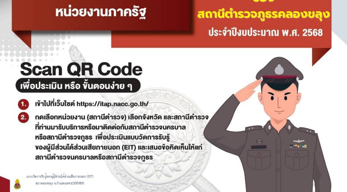 การประเมินคุณธรรมและความโปร่งใสในการดำเนินงานของ สถานีตำรวจภูธรคลองขลุง ประจำปีงบประมาณ พ.ศ.2568สำนักงานคณะกรรมการป้องกันและปราบปรามการทุจริตแห่งชาติ ดำเนินการสำรวจระดับคุณธรรม และความโปร่งใสในการดำเนินงานของหน่วยงานภาครัฐ โดยใช้แบบสำรวจซึ่งได้รับการออกแบบเพื่อวัดระดับคุณธรรม และความโปร่งใสในการดำเนินงานของหน่วยงานภาครัฐ ผลการประเมินจะแสดงถึงระดับคุณธรรมและความโปร่งใส ในการดำเนินงานของหน่วยงานภาครัฐ และเป็นแนวทางปฏิบัติในการแก้ไข ปรับปรุง และพัฒนาการปฏิบัติราชการ ให้มีคุณธรรมและความโปร่งใสมากยิ่งขึ้นเพื่อให้ผลการประเมินสามารถสะท้อนการรับรู้ของท่านได้เป็นอย่างดี ท่านสามารถแสดงความเห็นได้อย่างอิสระ และขอยืนยันว่า ข้อมูลส่วนบุคคลของท่านและคำตอบของท่านจะถูกเก็บไว้เป็นความลับอย่างดีที่สุด และจะไม่ถูกนำไปเผยแพร่หรือใช้เพื่อการใด ๆ ทั้งสิ้น โดยการนำเสนอผลการวิเคราะห์ข้อมูลจะเป็นไปในลักษณะของภาพรวมเท่านั้น ไม่มีการวิเคราะห์หรือรายงานเป็นรายบุคคลแต่อย่างใด ความร่วมมือของท่านจะช่วยสนับสนุนให้เกิดการพัฒนาและปรับปรุงระดับคุณธรรมและความโปร่งใสในการดำเนินงานของหน่วยงานภาครัฐ ขอขอบคุณในความร่วมมือมา ณ โอกาสนี้