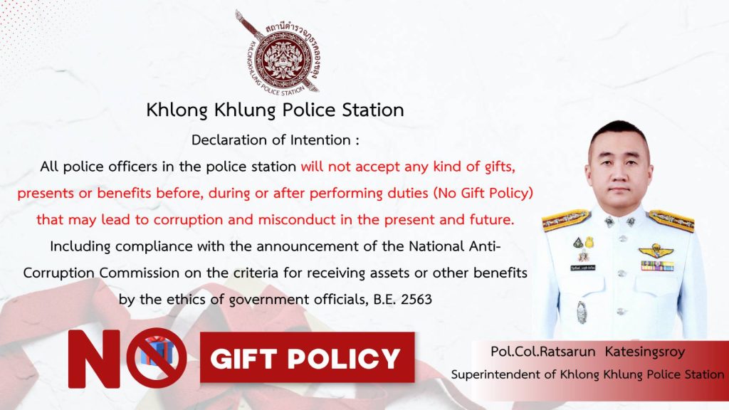 - ทำความเข้าใจให้แก่ข้าราชการตำรวจในสถานีทุกนาย ได้รับทราบและถือปฏิบัติตามประกาศนโยบายการต่อต้านการรับสินบน (Anti-Bribery Policy) ของสถานีตำรวจ พร้อมทั้งปลูกฝังให้ข้าราชการตำรวจได้ปฏิบัติหน้าที่ด้วยความซื่อสัตย์ สุจริต ไม่รับสินบน อดทน อดกลั้น ให้บริการประชาชนอย่างเต็มกำลังความสามารถ พร้อมทั้งปลูกฝังให้ข้าราชการตำรวจปฏิบัติตามประมวลจริยธรรมและจรรยาบรรณตำรวจ