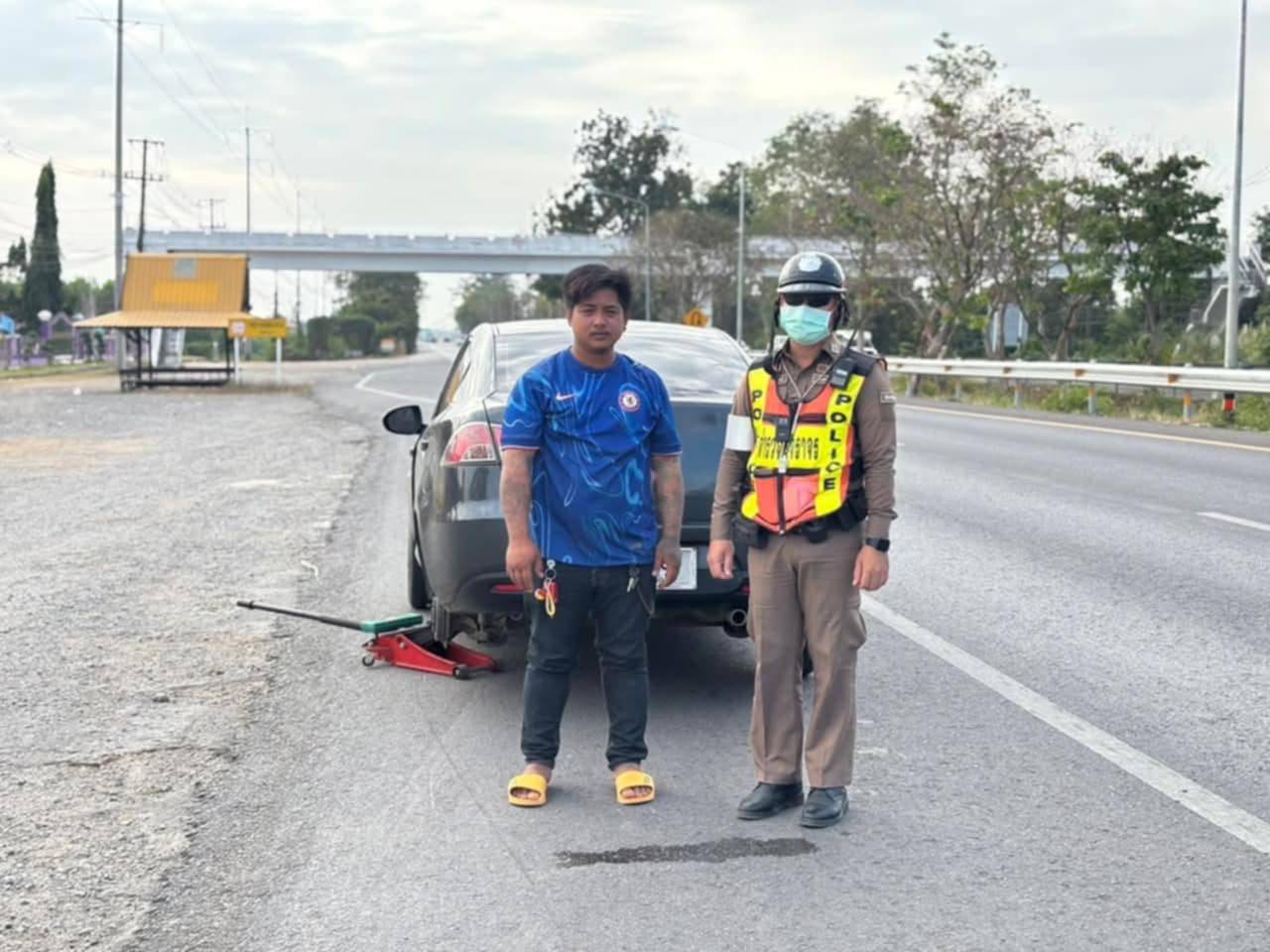 ได้ให้ความช่วยเหลือประชาชน รถยนต์ยางแตก จึงได้ประสานช่างมาดำเนินการเปลี่ยนยางรถเพื่อให้เดินทางต่อไป